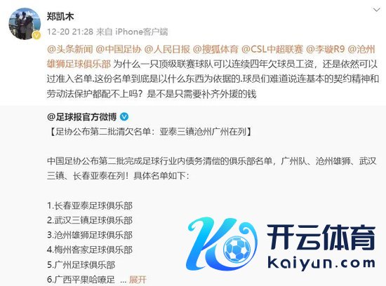固然广州队、湖南湘涛均有球员对球队登上清欠名单提议质疑,但沧州雄狮多达10名球员死力于发声催讨欠薪,不仅激发中国足协官方回答,也将俱乐部推上了风口浪尖。从12月20日郑凯木在社媒账号质疑沧州雄狮欠薪运行,已有至少10名沧州雄狮球员跟进质疑俱乐部欠薪,其中包括小奥斯卡、郑达伦、王鹏、门将邵璞亮等主力。行将归化中国的小奥斯卡默示于今莫得收到沧州雄狮的任何欠薪转账,但强调我方不但愿曾效用的沧州雄狮因无法通过准入而完毕。郑达伦默示效用一个赛季只收到4个月工资,已离队两年的旧将郭皓也转发了郑凯木声讨欠薪的微博。