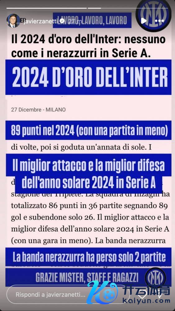 萨内蒂暗示:“责任、责任、责任。黄金般的2024年,国米在2024年介意甲联赛一共拿到89分,并且少赛一场。咱们是(意甲)年度最好进击球队和最好防患球队,国米只输了2场比赛。感谢指示、责任主谈主员、球员们。”